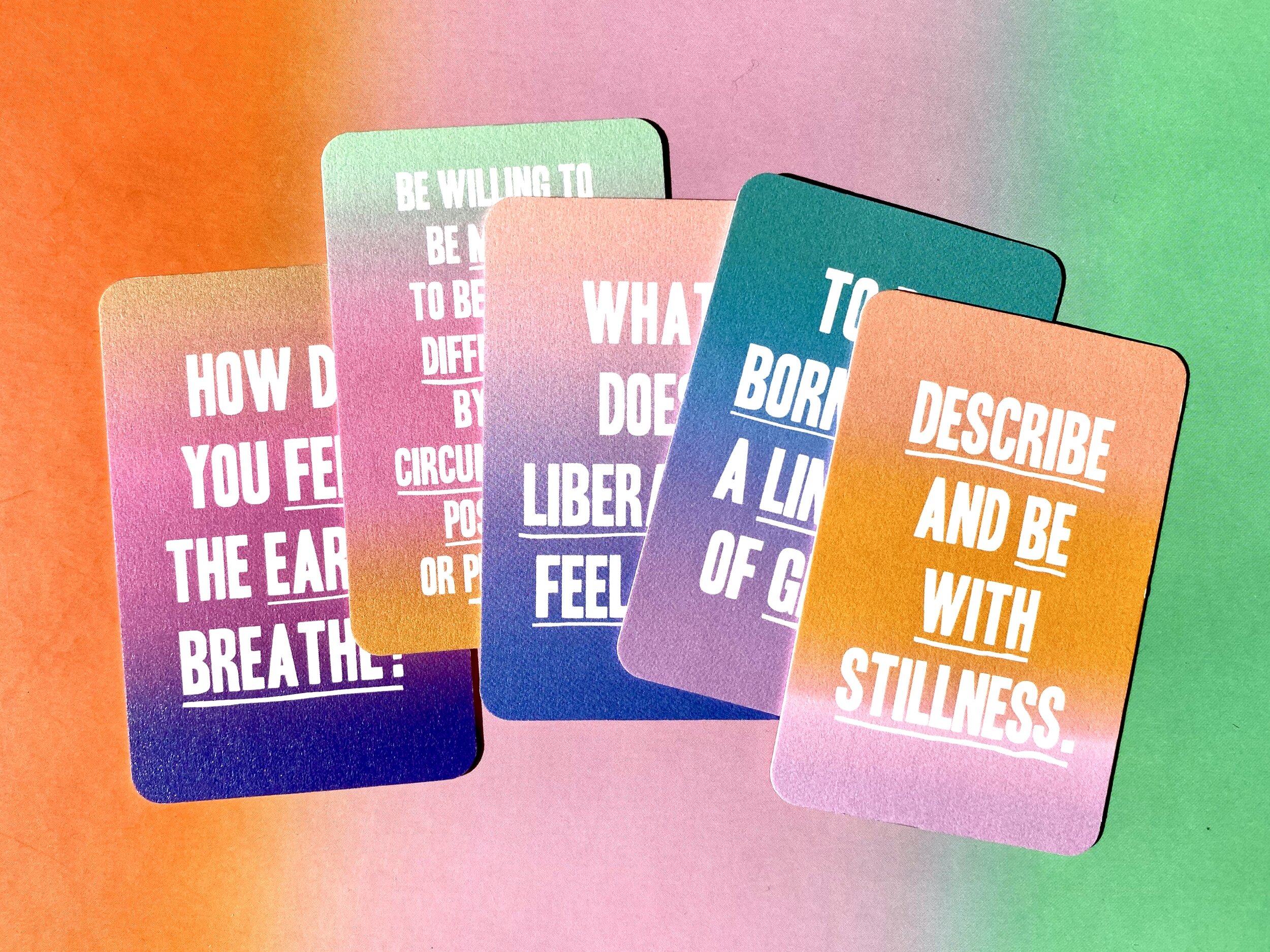 The set of cards can be used as a facilitation medium in a multiplicity of experimental ways to be defined by card players. The deck is divided into two series of cards: Building Blocks and Ascending Blocks. Building Blocks invite card-players to reflect on specific themes such as “Interdependence”, “Reciprocity”, and “Grief” as they relate to the futures of our worlds. Building Blocks provide anchors for reflecting on collective futures and possibilities, as well as ancestors, histories, and challenges. Ascending Blocks open up a space and project a destination. They create a path to breathe life into, directly inviting conversation, collective processing, and community-minded practice.